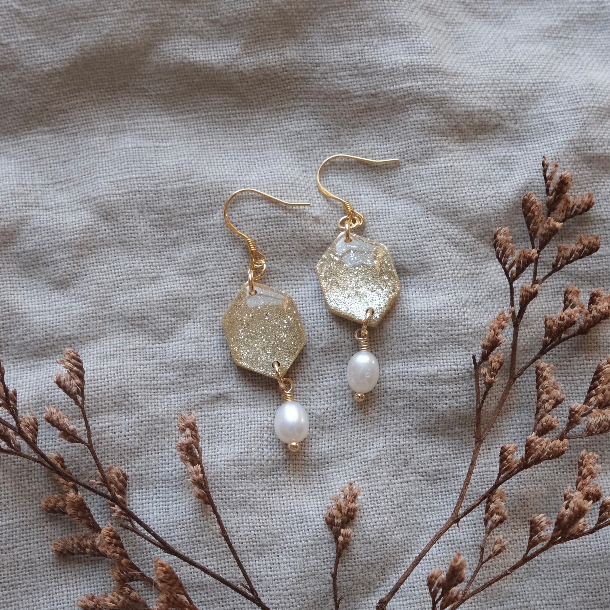 Aisling earrings in Champagne Glitter, with freshwater pearls. Lightweight, hypoallergenic earrings handmade from polymer clay. Approximately 4cm in length.