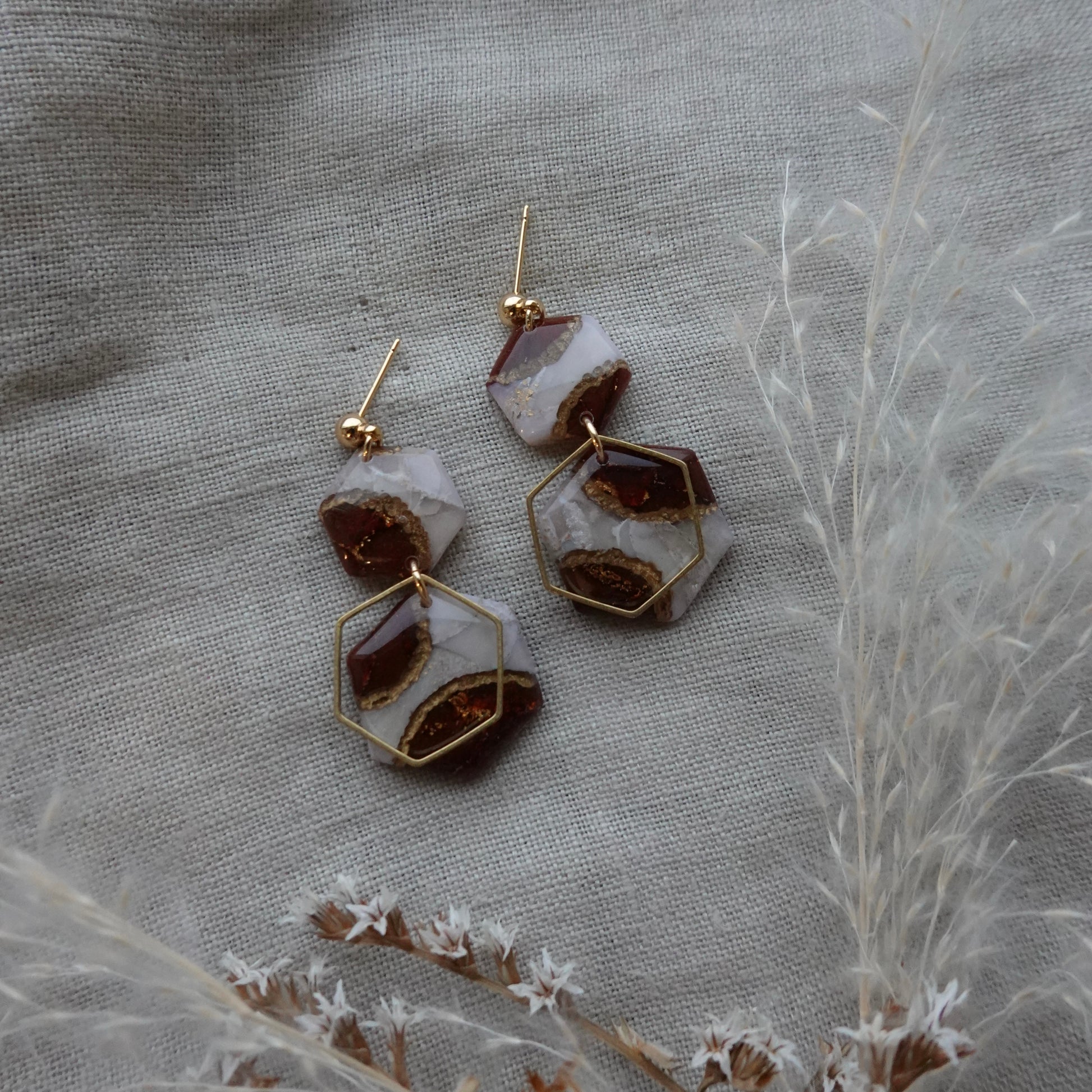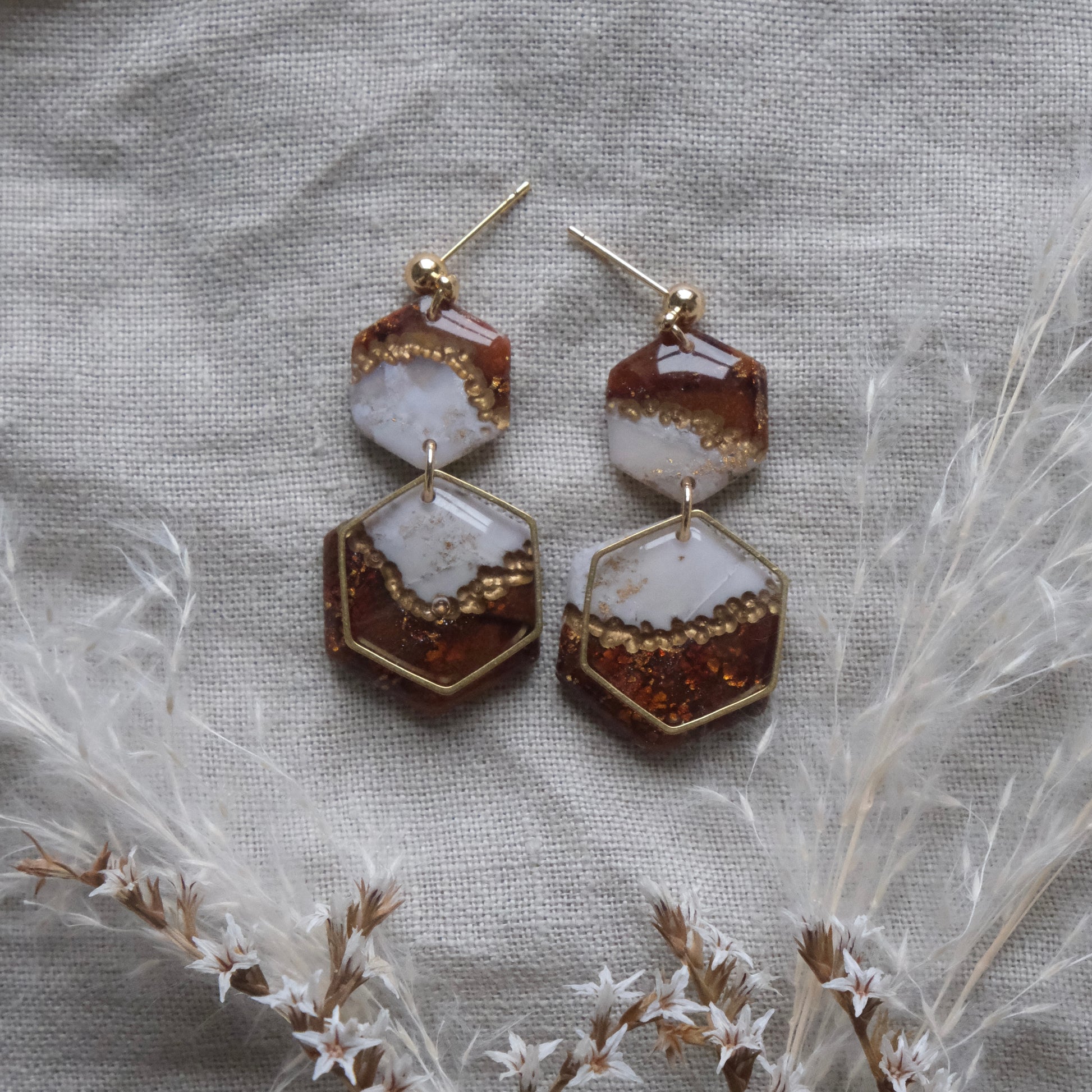Anu earrings in Double Chocolate & Gold. Lightweight, hypoallergenic earrings handmade from polymer clay. Approximately 4.5cm in length.