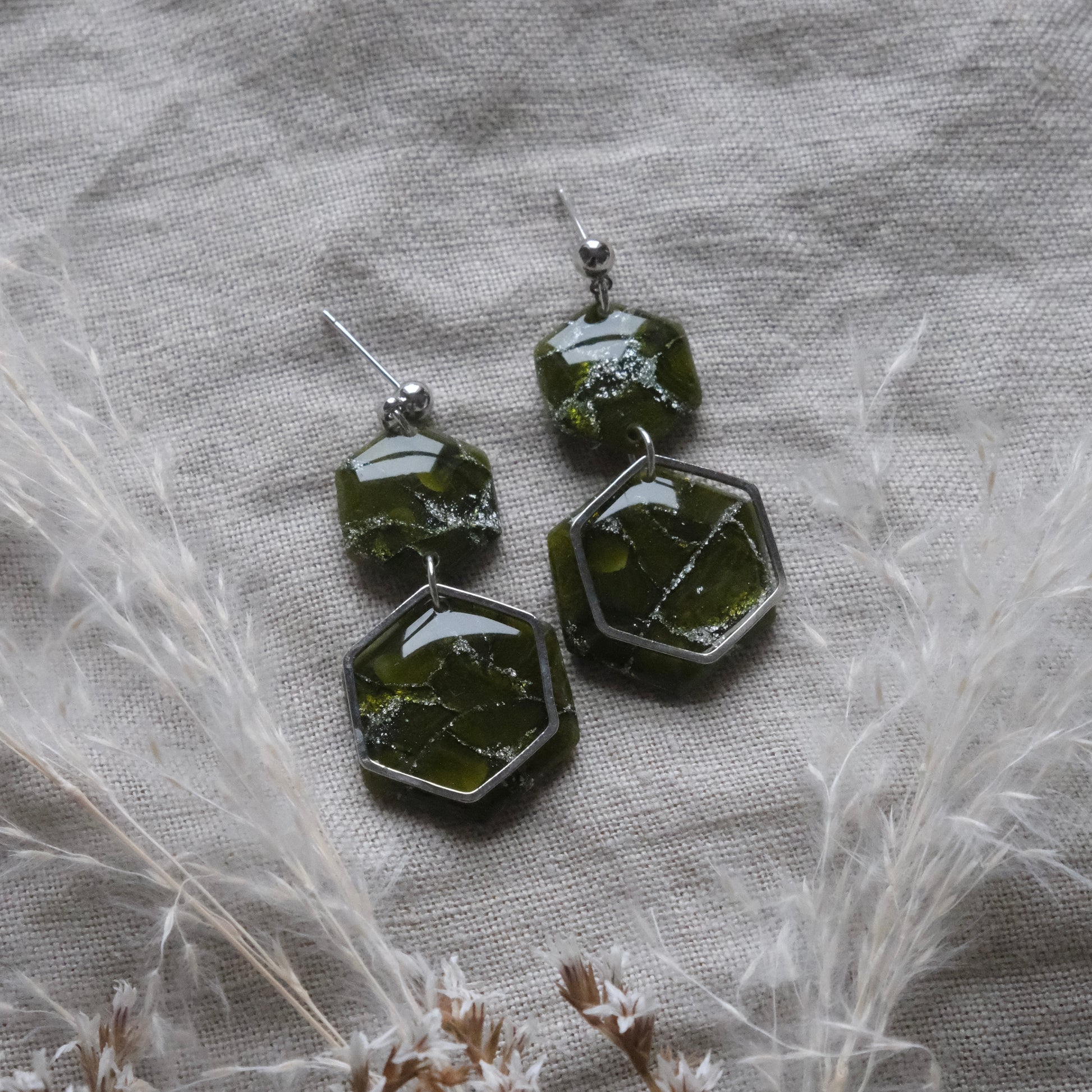 Anu earrings in Army Green and Silver. Lightweight, hypoallergenic earrings handmade from polymer clay. Approximately 4.5cm in length.