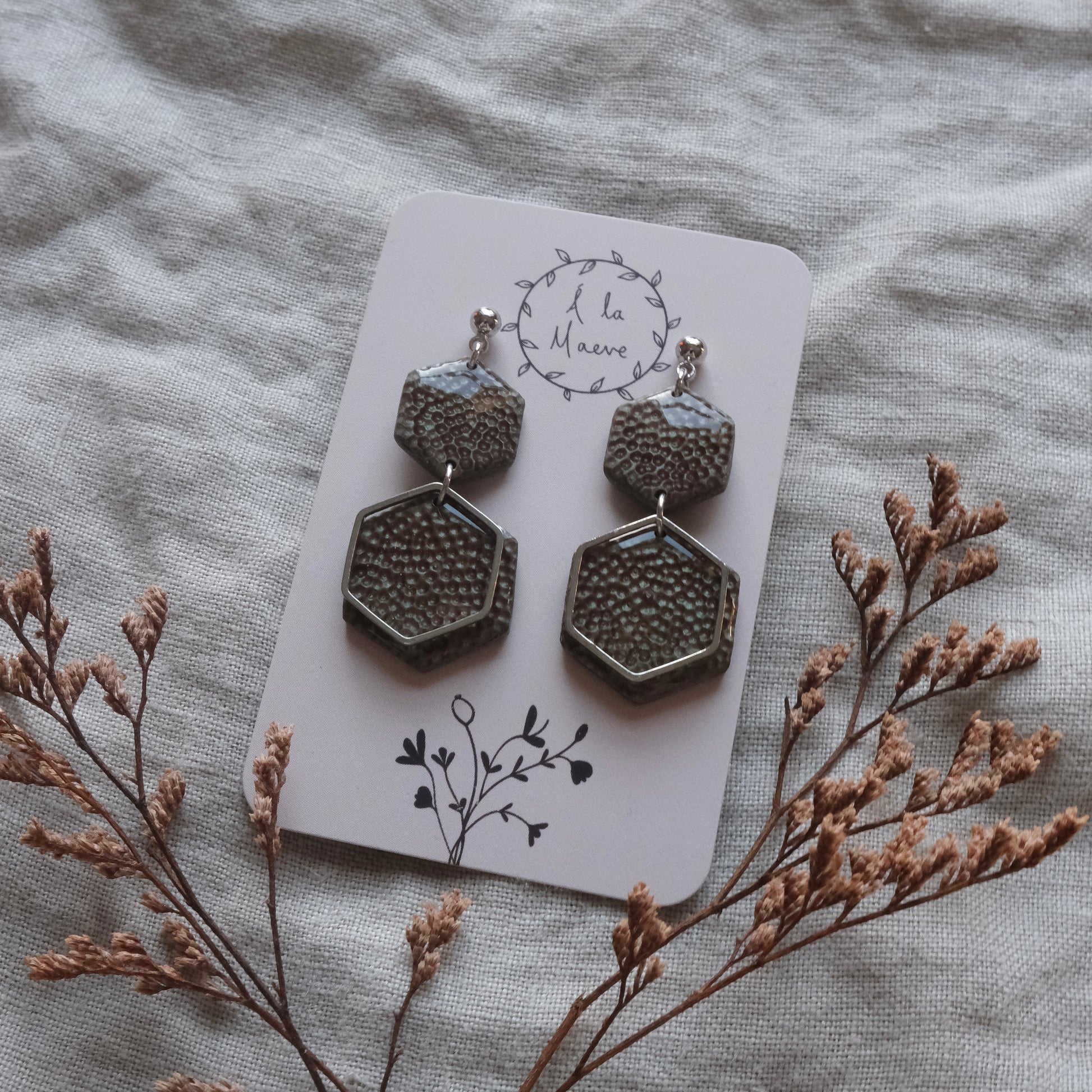 Anu in Hammered Labradorite effect. Lightweight, hypoallergenic earrings handmade with polymer clay. Approximately 4.5cm in length.
