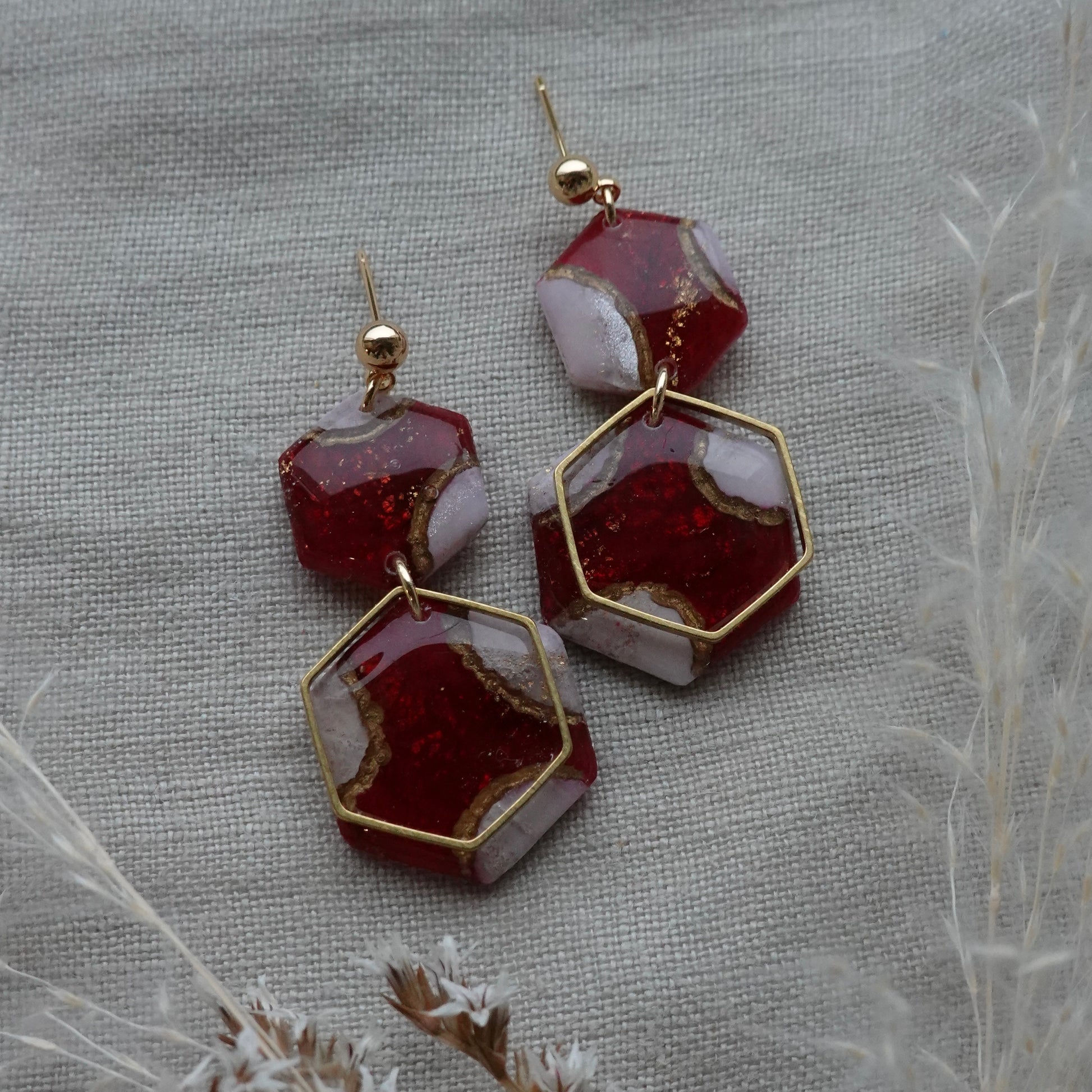 Anu earrings in Red Velvet. Lightweight, hypoallergenic earrings handmade from polymer clay. Approximately 4.5cm in length.