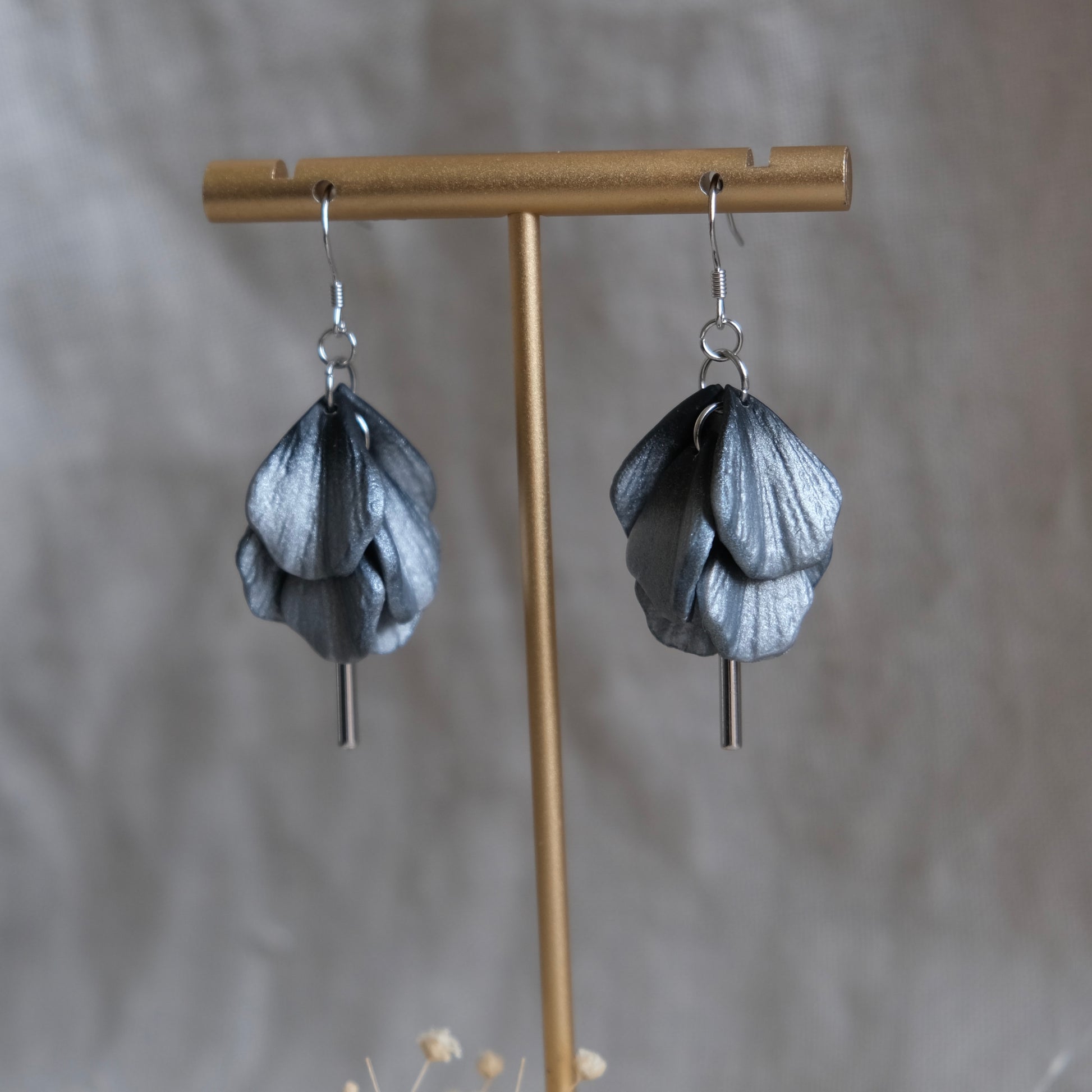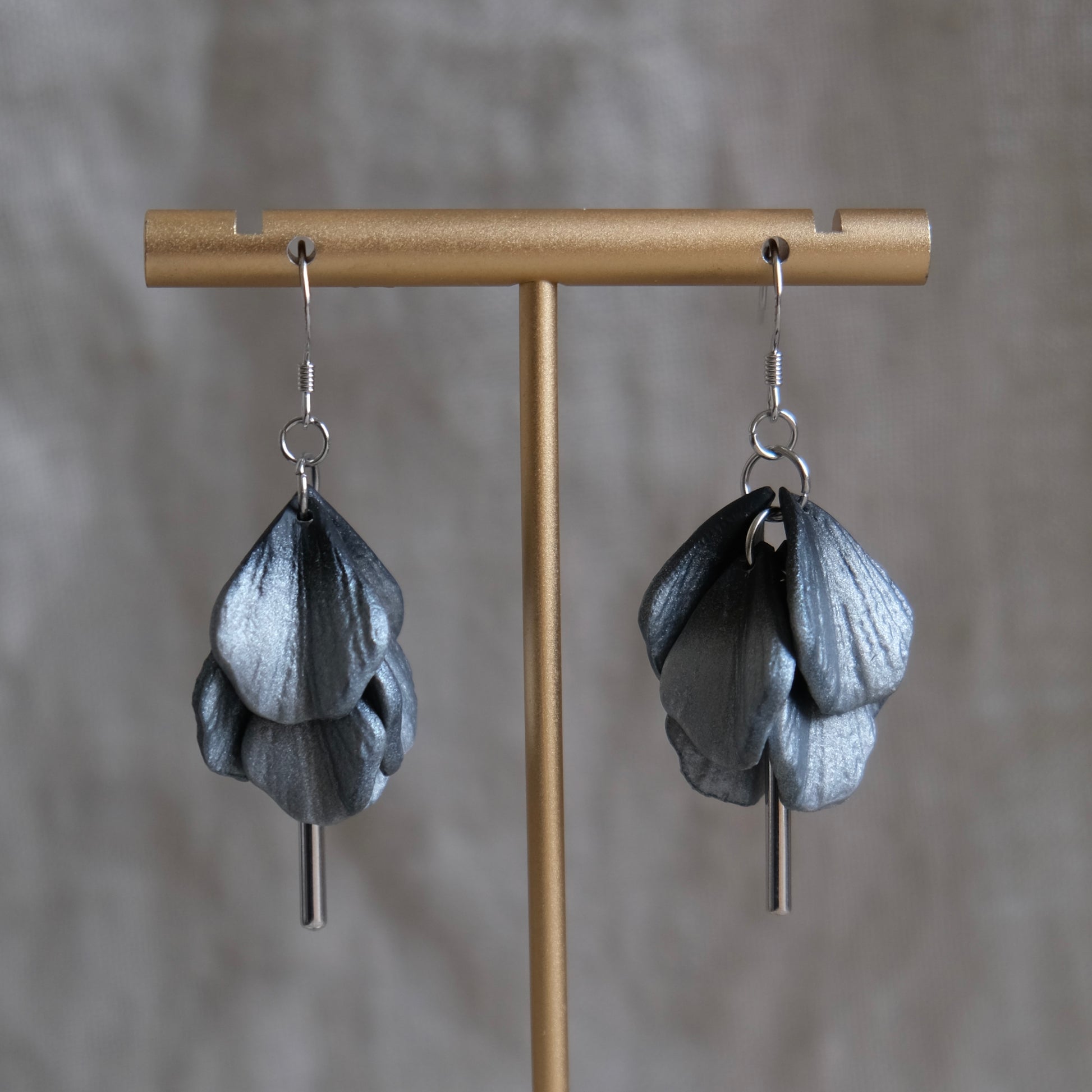 Bláthine Earrings in Silver and Black with Rhodium-plated bar. Lightweight, hypoallergenic earrings handmade from polymer clay.