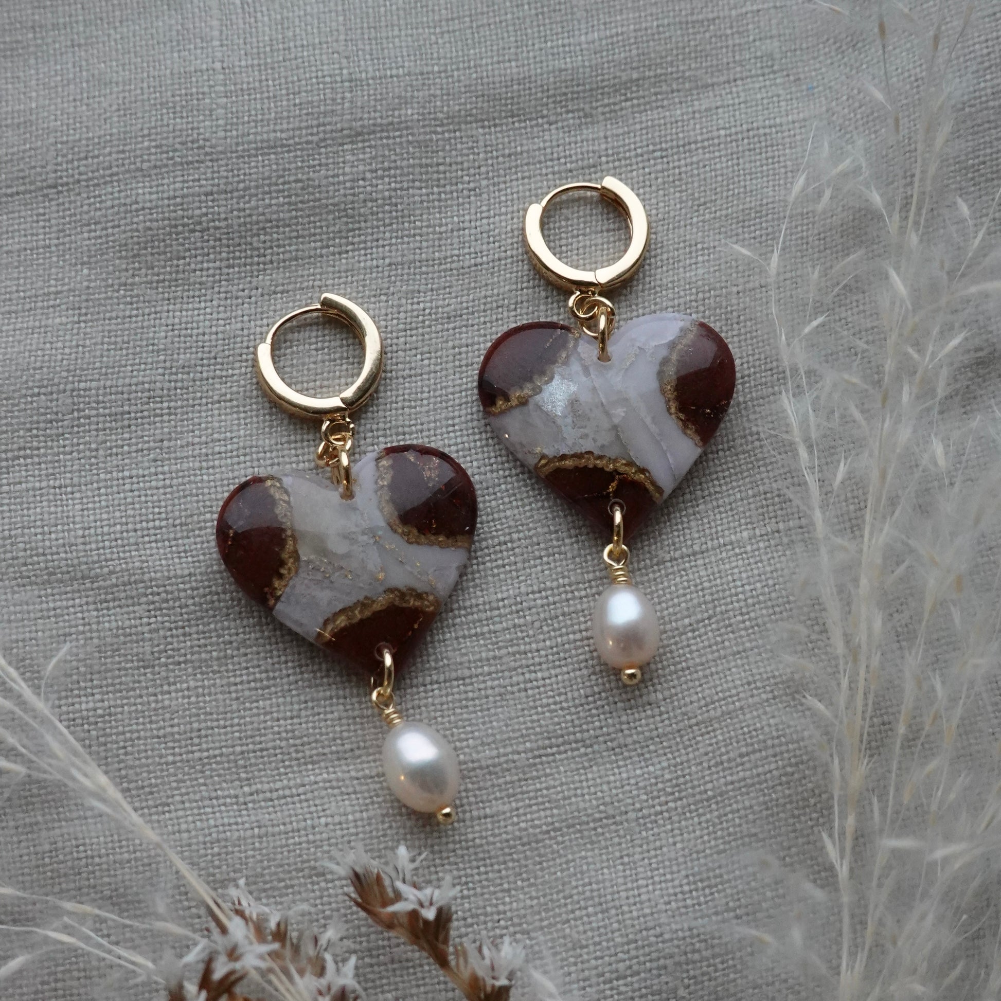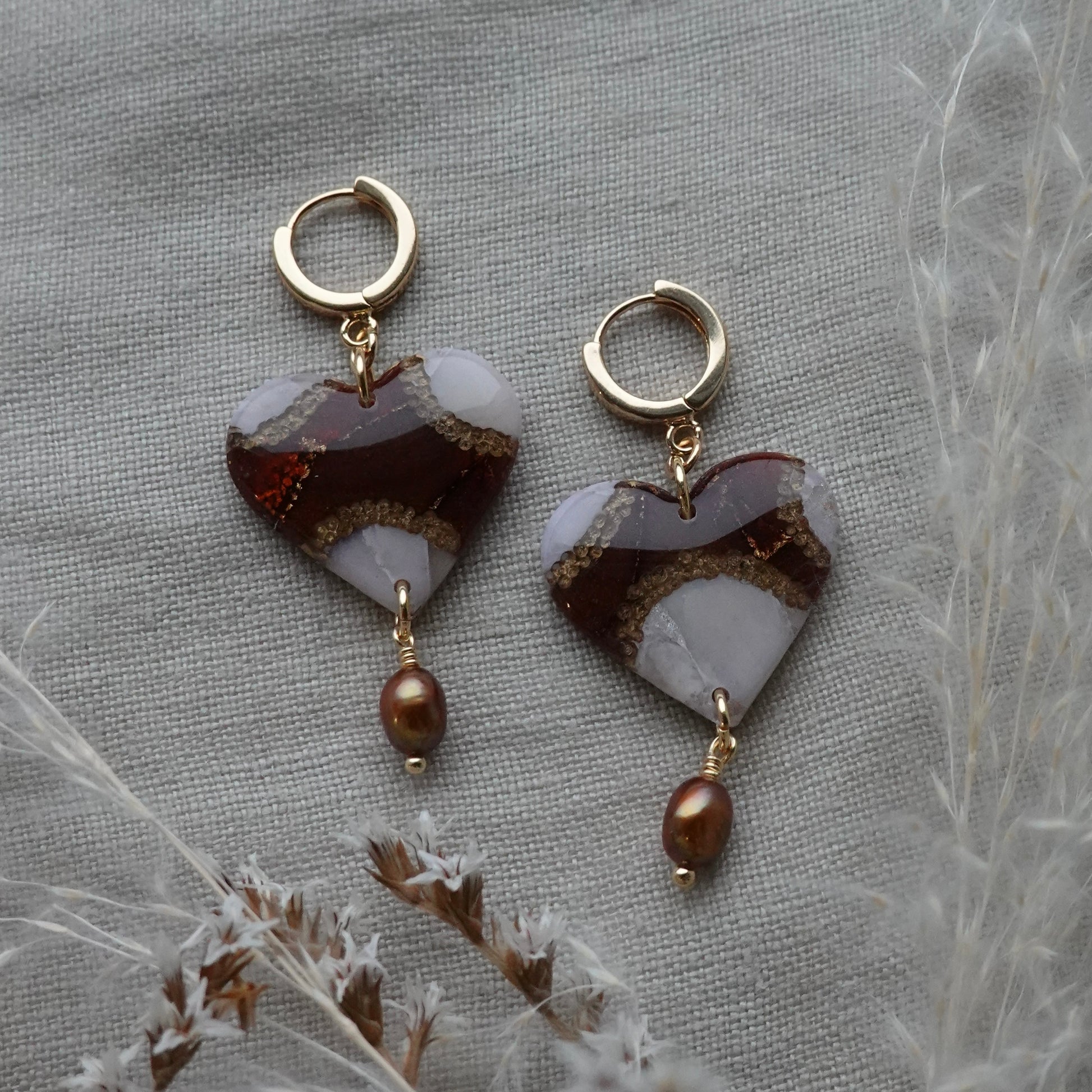 Croí earrings in Double Chocolate & Gold. Lightweight, hypoallergenic earrings handmade from polymer clay, with green freshwater pearls. Approximately 5cm in length.