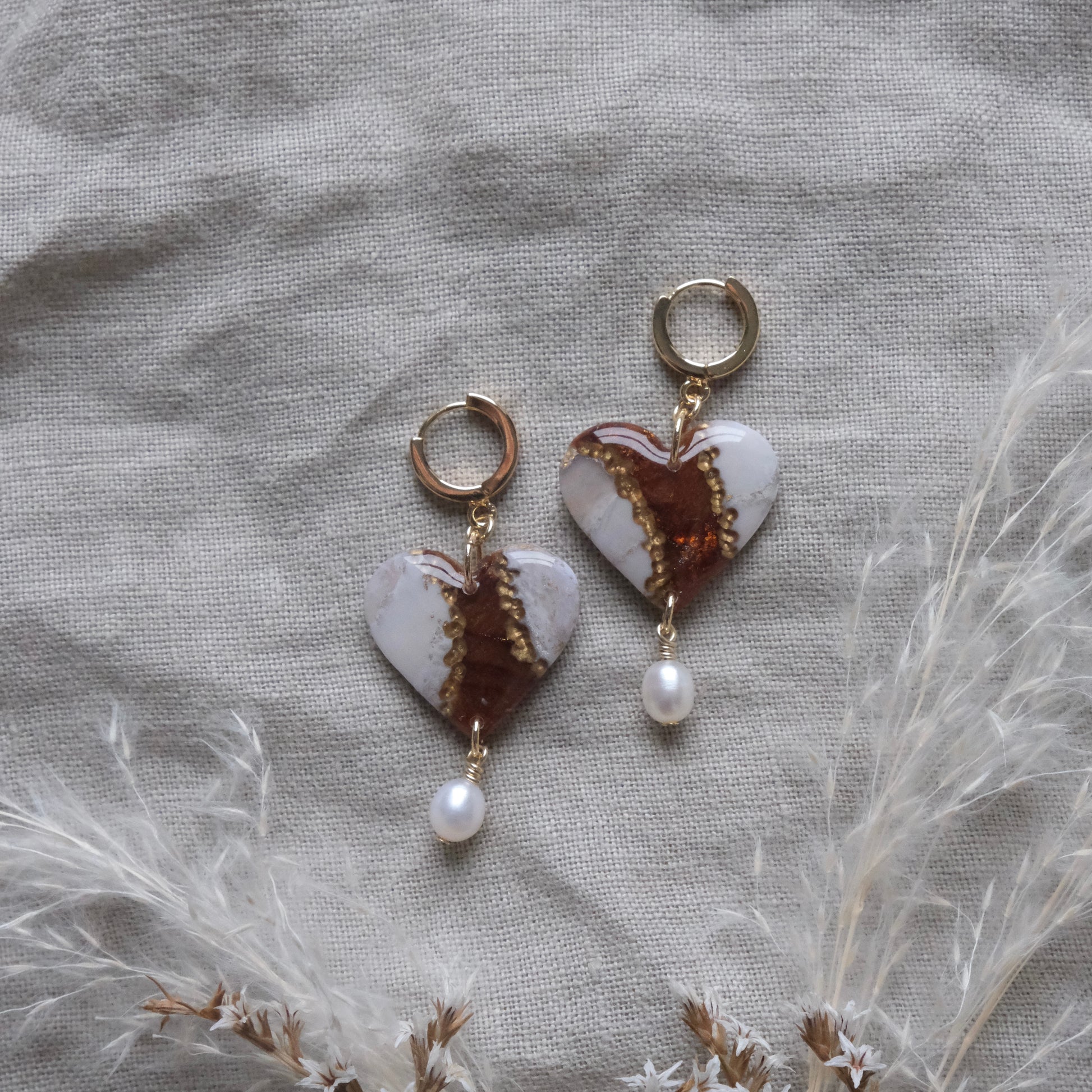 Croí earrings in Double Chocolate & Gold. Lightweight, hypoallergenic earrings handmade from polymer clay, with green freshwater pearls. Approximately 4cm in length.