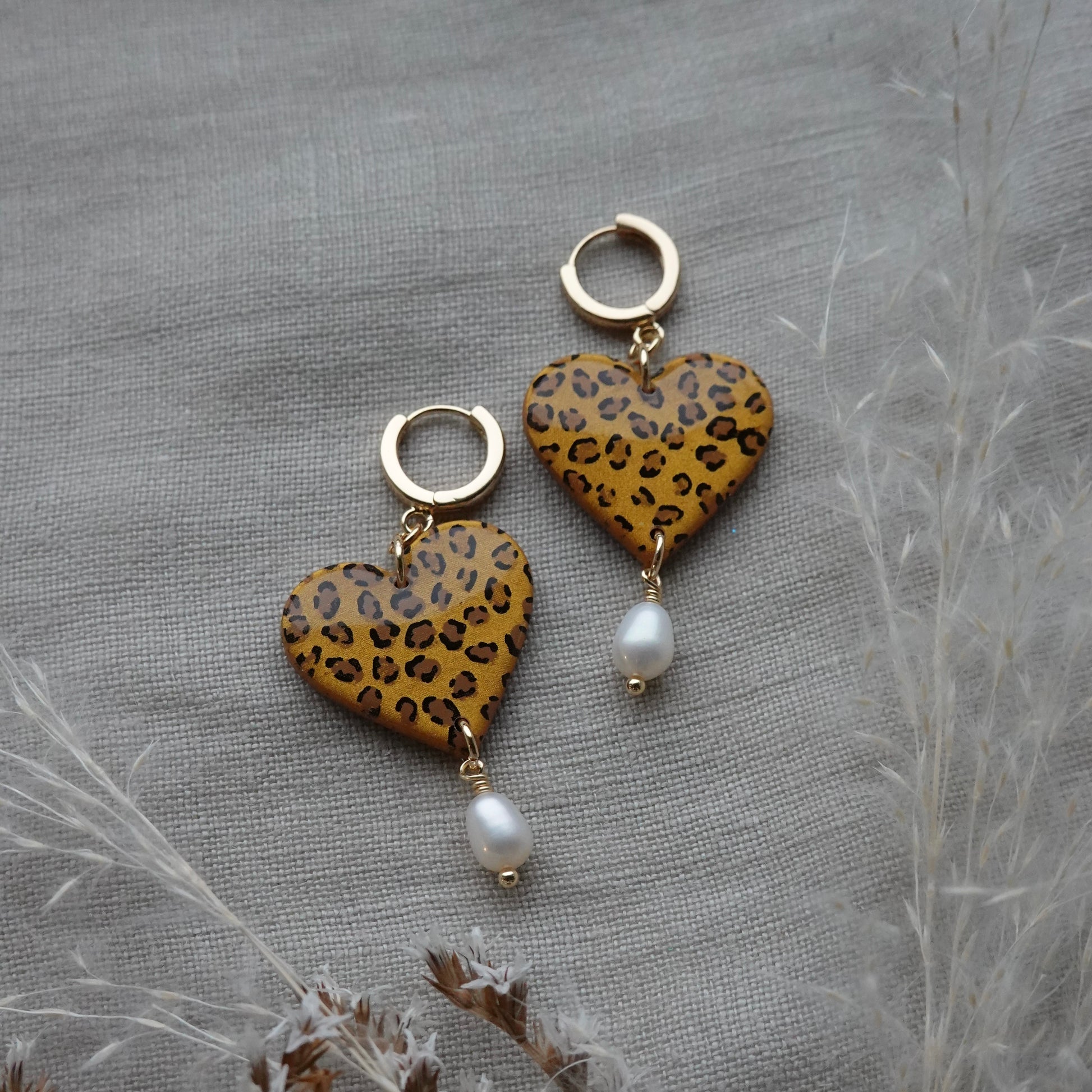 Croí earrings in Gold leopard print, with black glass charm. Lightweight, hypoallergenic earrings handmade from polymer clay. Approximately 5cm in length.