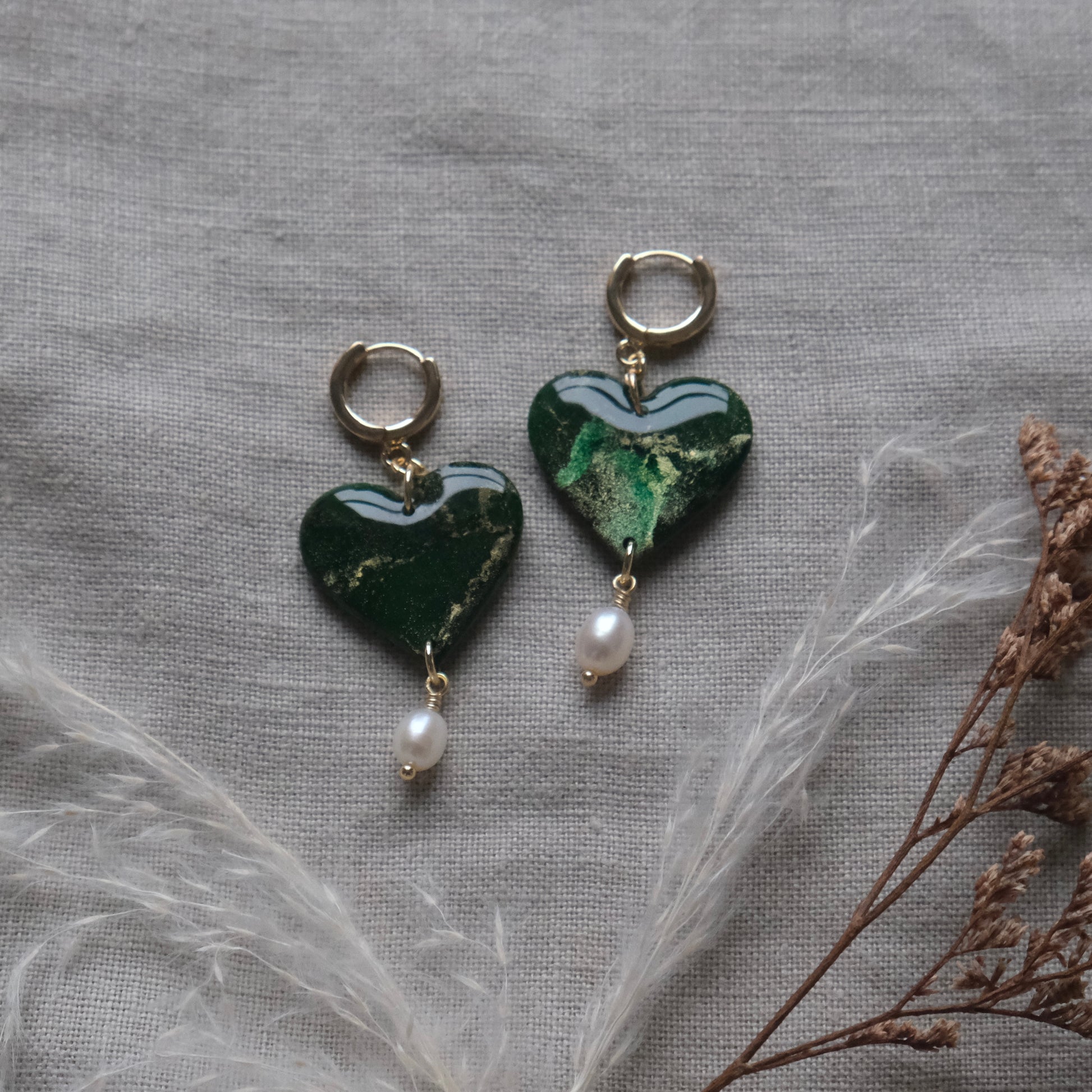 Croí earrings in Green Ink & Gold. Lightweight, hypoallergenic earrings handmade from polymer clay. Approximately 4.8cm in length.