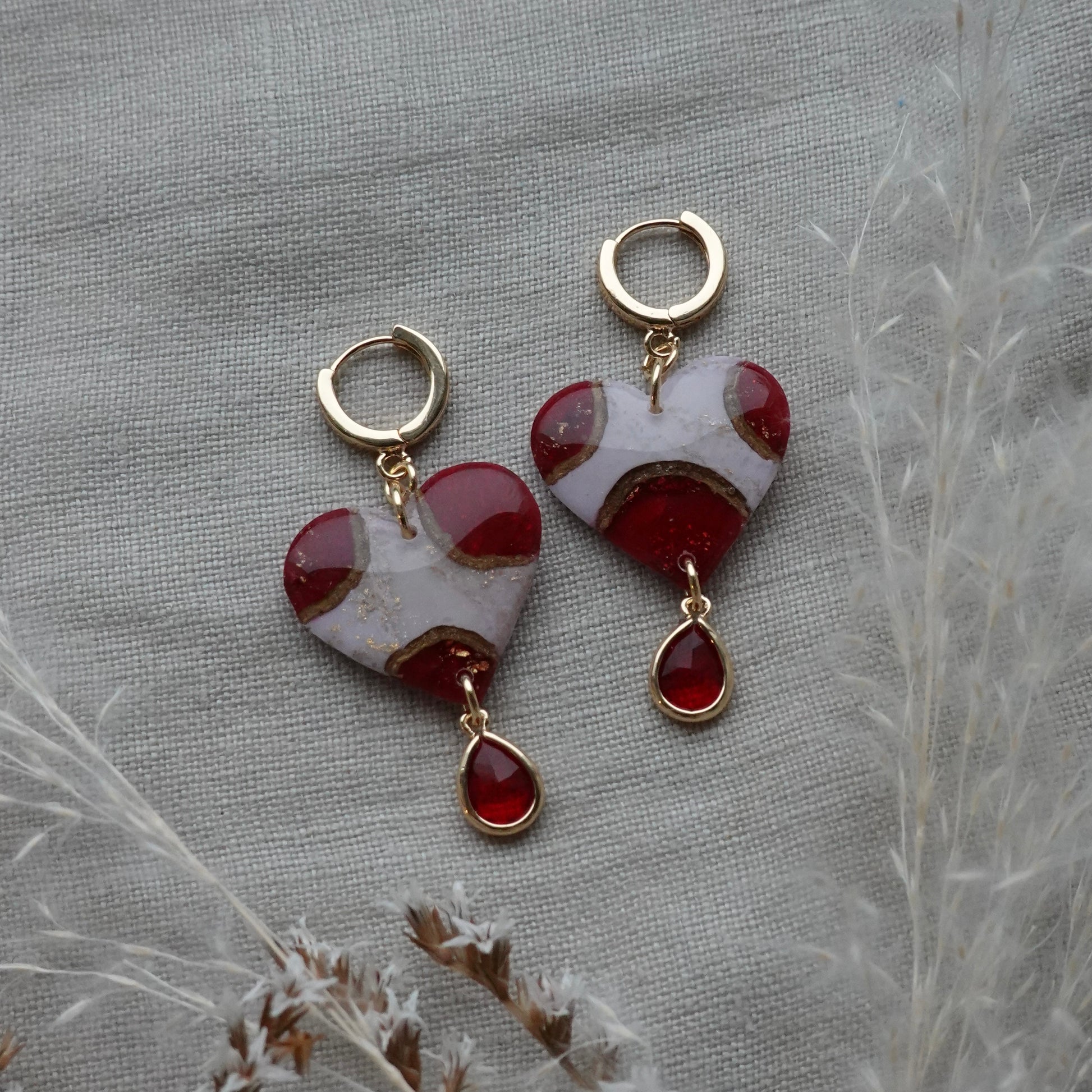 Croí earrings in Red Velvet. Lightweight, hypoallergenic earrings handmade from polymer clay, with green freshwater pearls. Approximately 5cm in length.