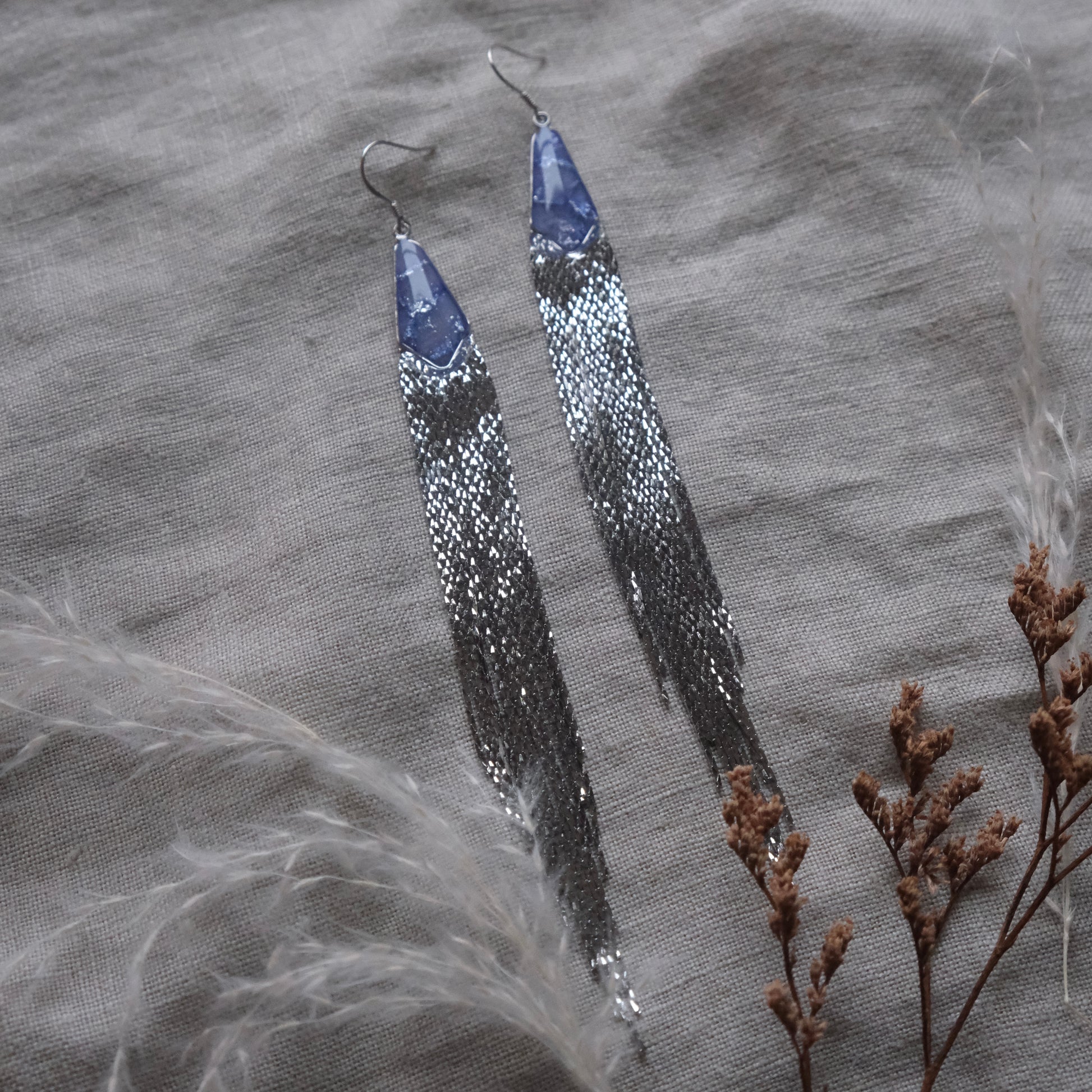 Lasairíona earrings in Hydrangea & Silver. Lightweight, hypoallergenic earrings handmade from polymer clay. Approximately 12cm in length.