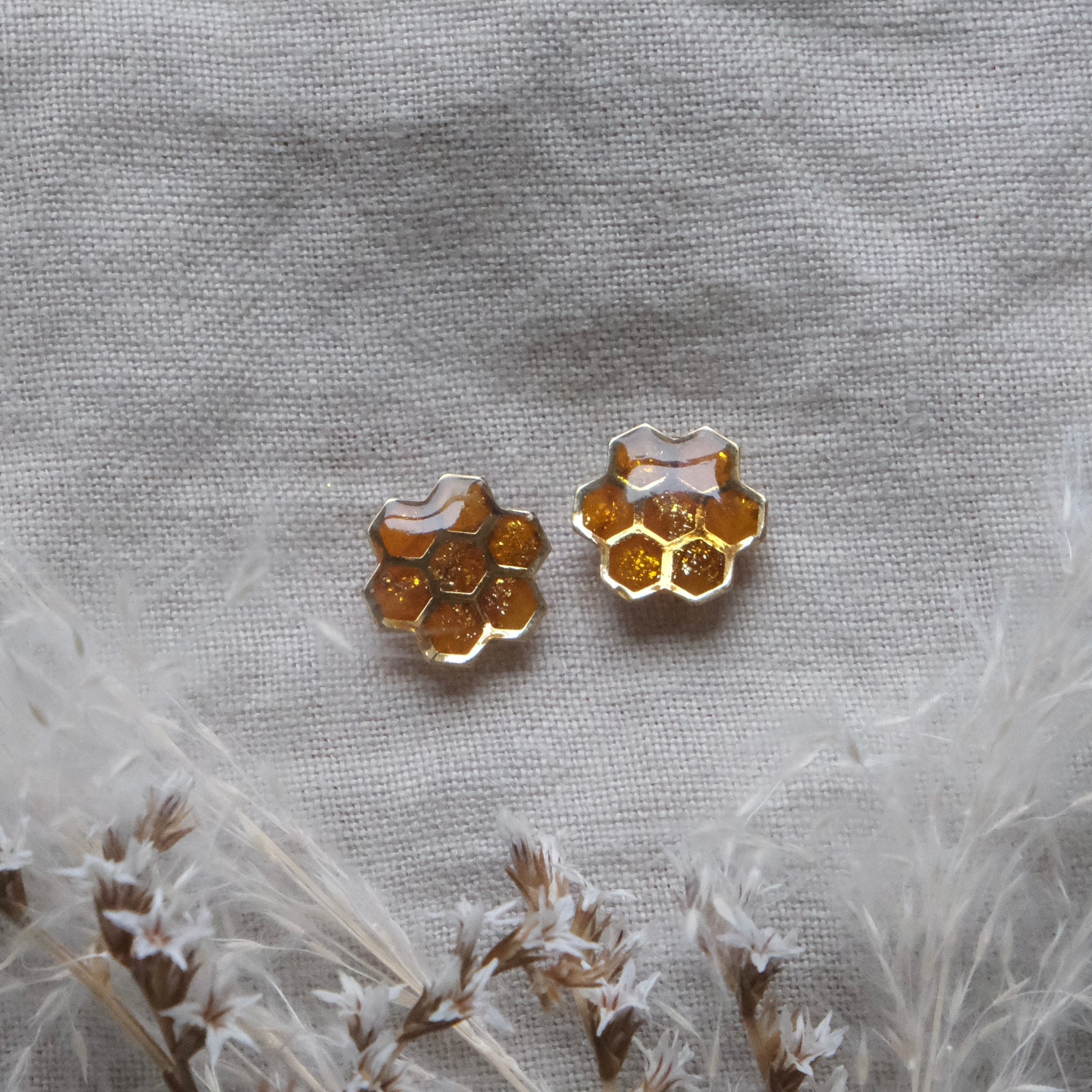 Meala studs in Honey and Gold. Lightweight, hypoallergenic earrings handmade from polymer clay. Approximately 1.5cm in length.