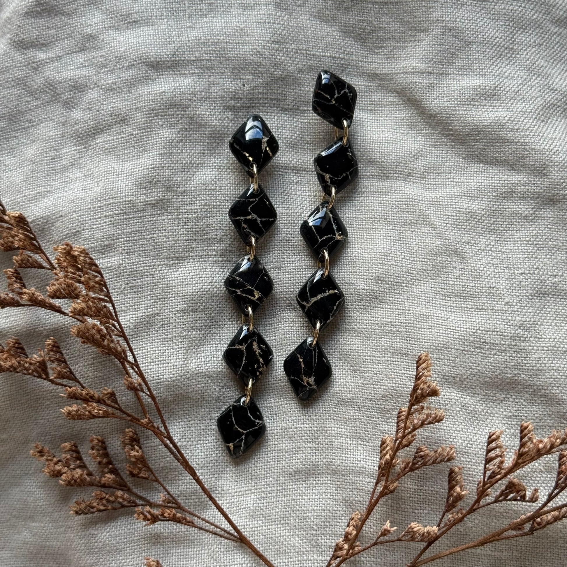 Medb earrings in Black Marble. Lightweight, hypoallergenic earrings handmade from polymer clay. Approximately 8cm in length.