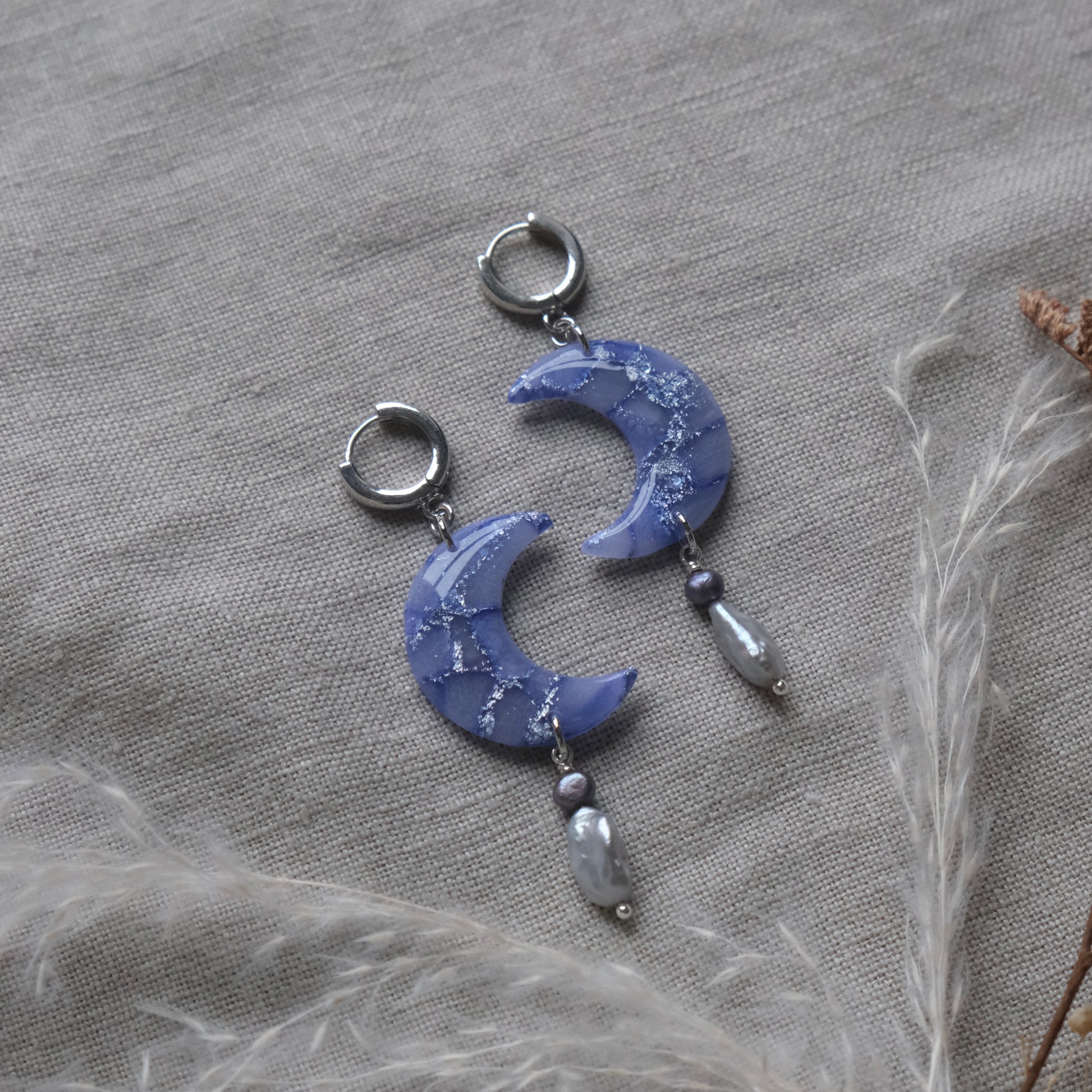 Mini Luna earrings in Hydrangea & Silver. Lightweight, hypoallergenic earrings handmade from polymer clay. Approximately 6cm in length.