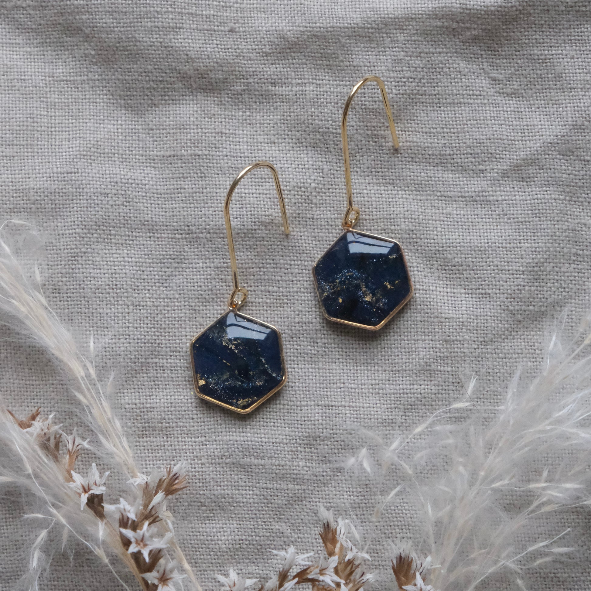 Mini Míde earrings in Navy and Gold. Lightweight, hypoallergenic earrings handmade from polymer clay. Approximately 3cm/4.5cm in length.