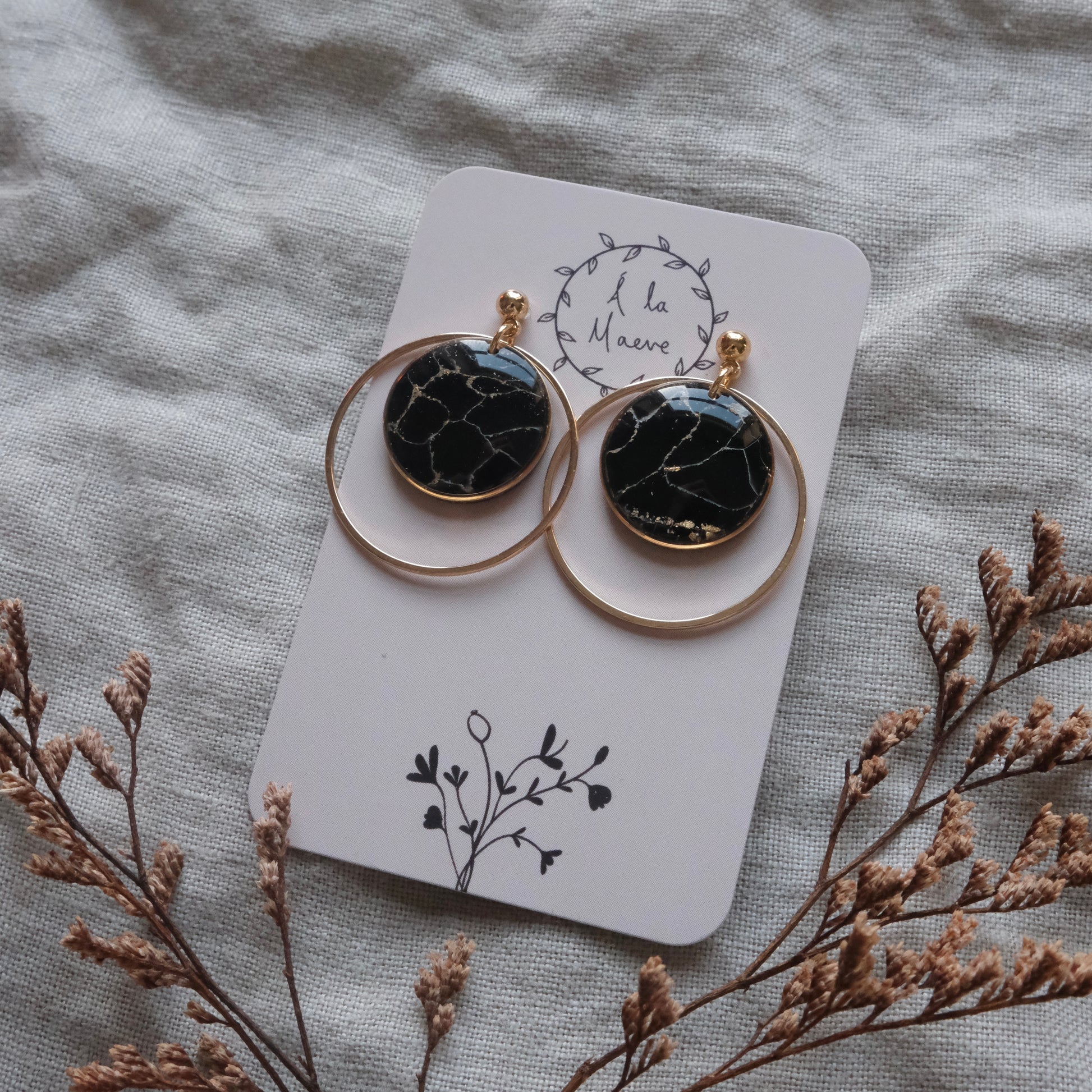 Ríona in Black Marble & Gold. Lightweight, hypoallergenic earrings handmade from polymer clay. Approximately 4cm in length.