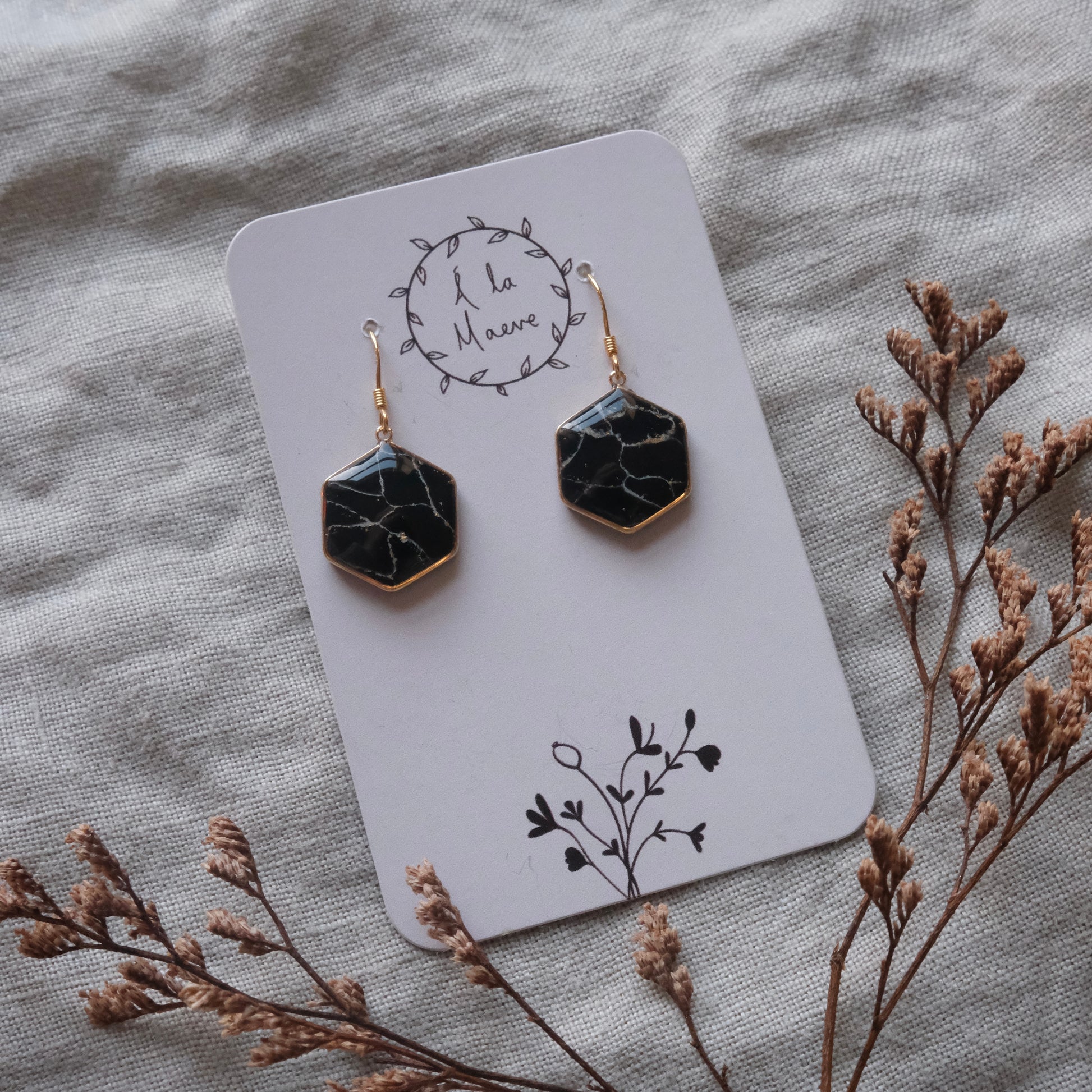 Mini Míde in Black Marble & Gold. Lightweight, hypoallergenic earrings handmade from polymer clay. Approximately 3cm in length.