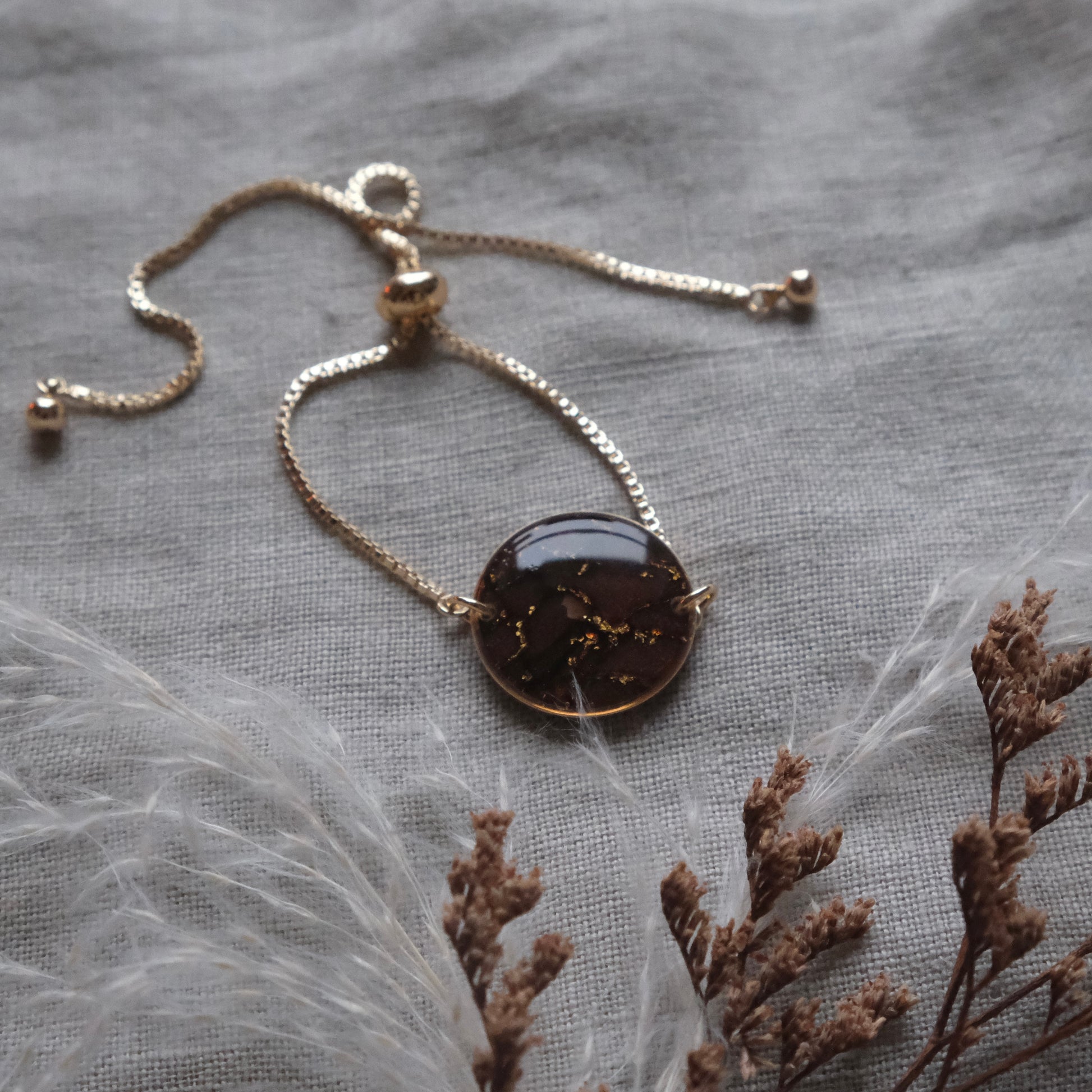 Síofra bracelet in Brown and Gold. Lightweight, hypoallergenic earrings bracelet from polymer clay. Approximately 2cm in diameter, with an adjustable gold-plated bracelet.