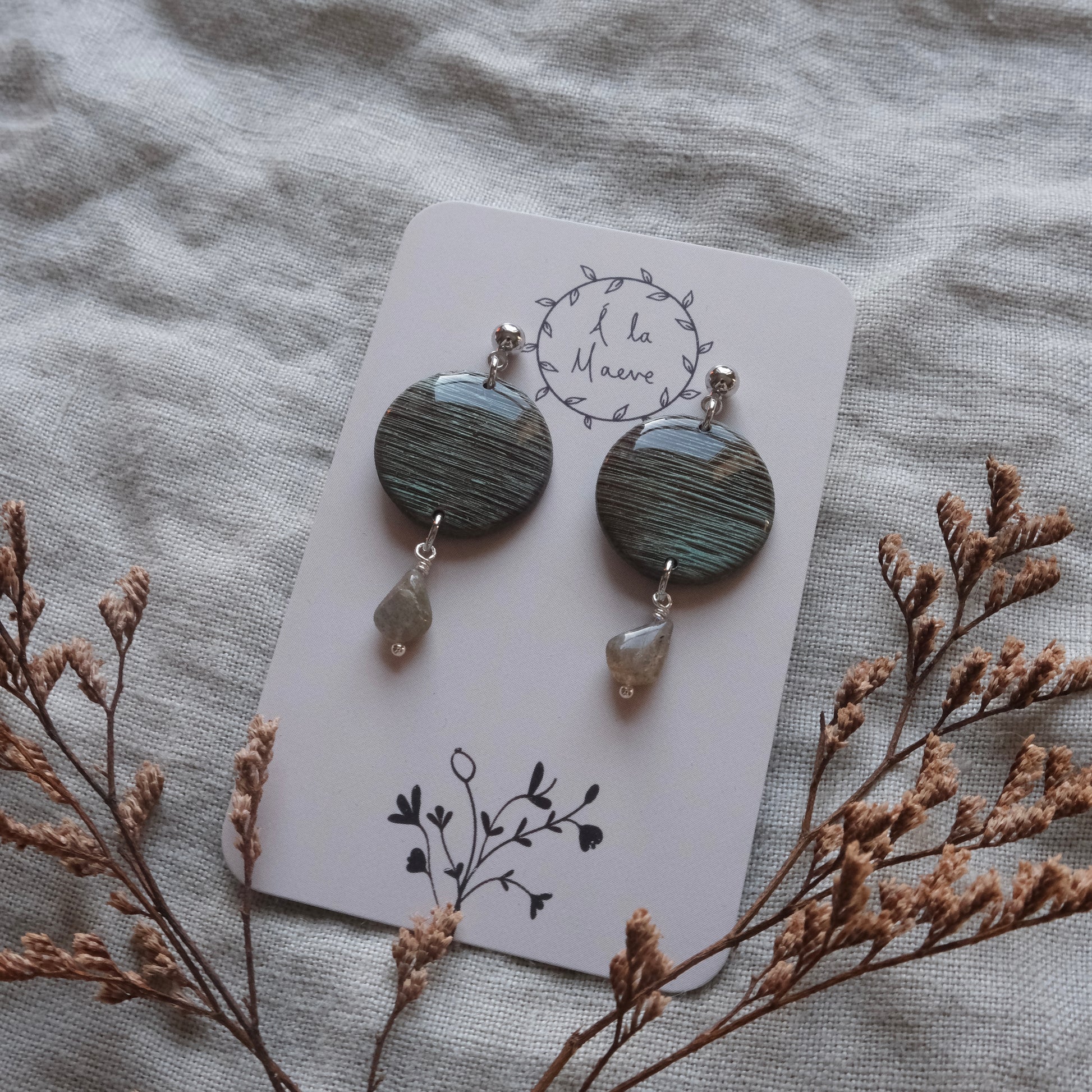 Síofra earrings in Brushed Labradorite effect. Lightweight, hypoallergenic earrings handmade from polymer clay. Approximately 4cm in length.